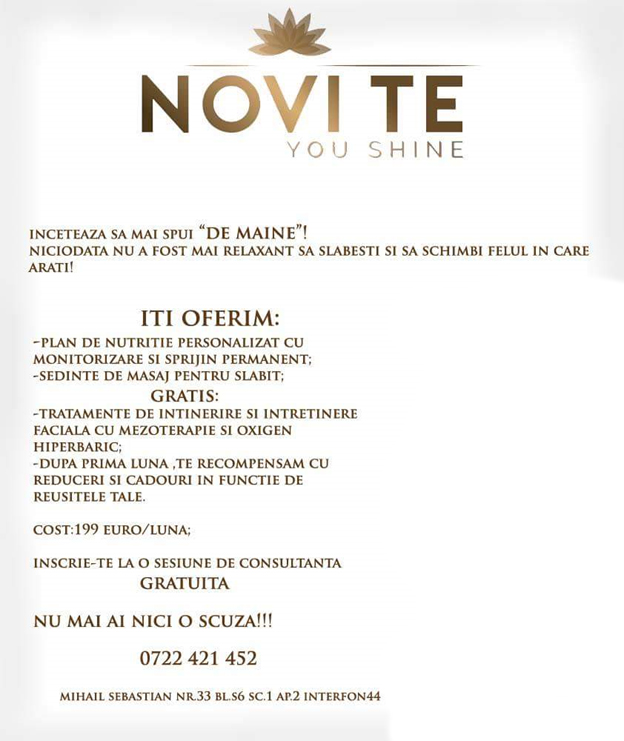 Acest serviciu are ca si obiectiv integrarea ta intr-o echipa care sa te ajute sa adopti un stil de viata sanatos, sa te invete elemente prin care dupa ce ai invatat si implementat informatiile, sa nu depinzi de noi, chiar daca iti stam oricand la dispozitie telefonic sau pe mail pentru orice nelamurire.